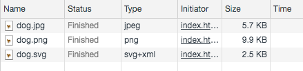 能夠看見(jiàn)Size欄位,同一張照片,從最小到最胖,分別是:SVG的2.5K>JPG的5.7K>PNG的9.9K,最大和最小差快四倍。