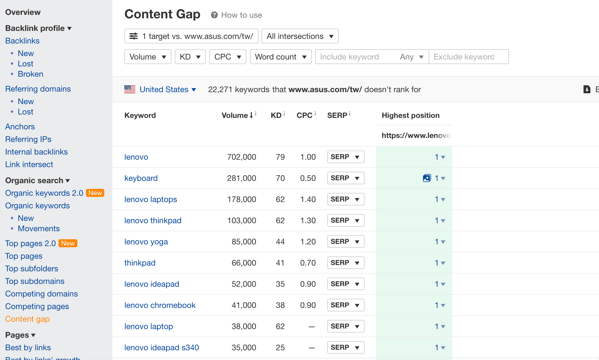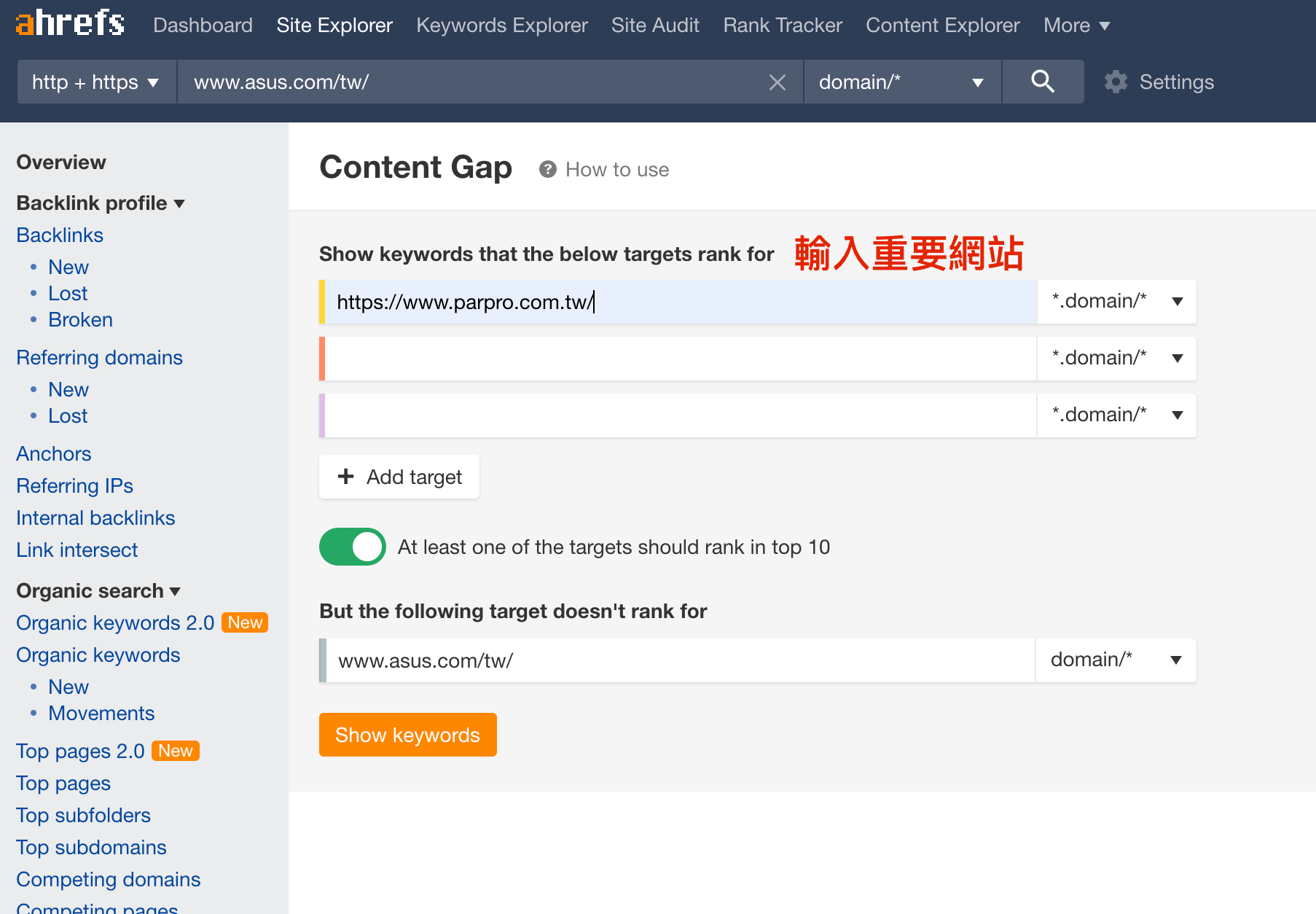 找到競爭對手后,我們也分析了與競爭對手相同的關鍵詞。接下來,這取決于我們與競爭對手的內(nèi)容差異Content gap我們可以比較這個區(qū)塊和特定網(wǎng)站的內(nèi)容差異。