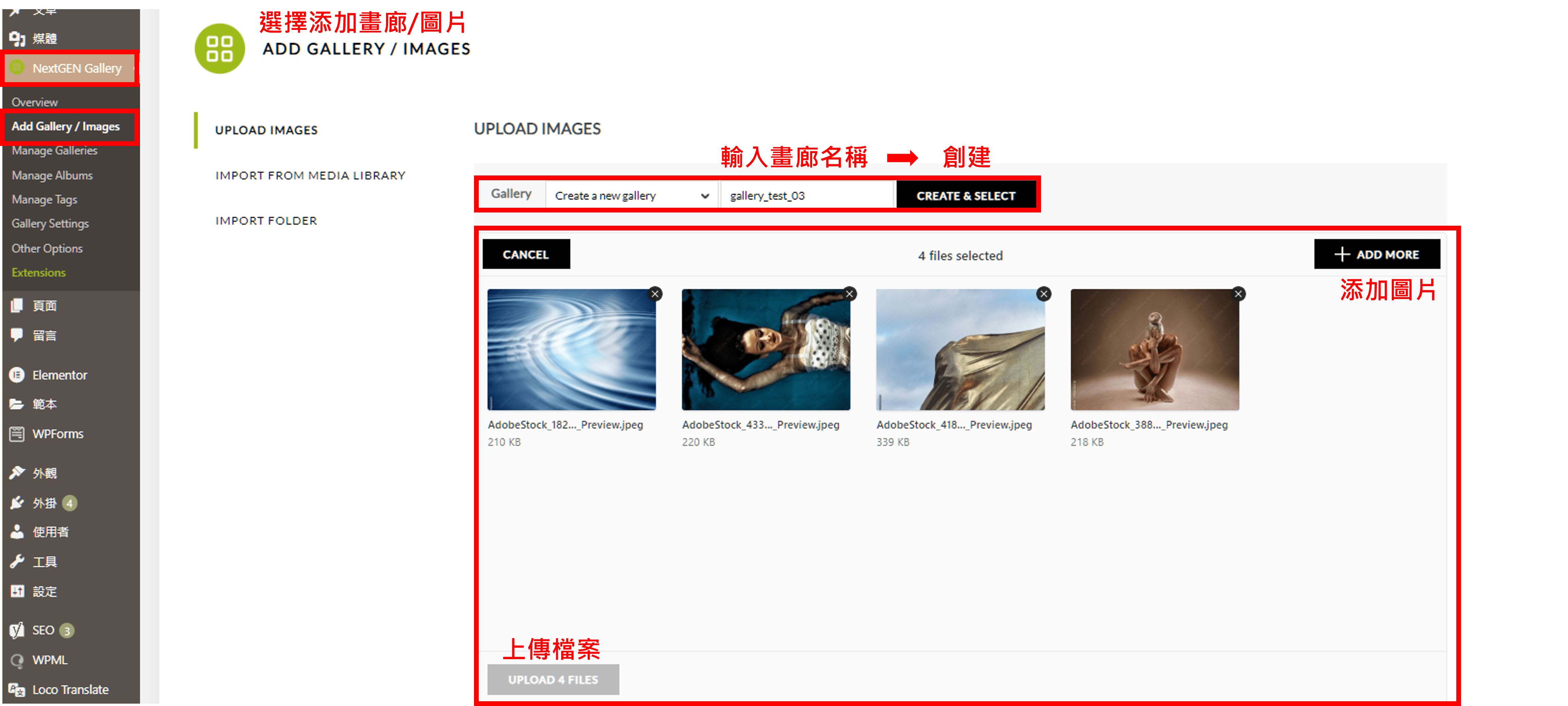 由左側(cè)選擇「addgallery/images」>「輸入畫廊名稱」>「create&select」>「addmore」可選擇或直接拖動(dòng)圖片>>「upload上傳」