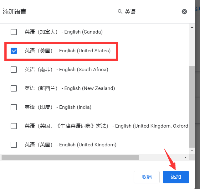 點(diǎn)擊“添加”選擇“英文-美國(guó)”(因?yàn)楣雀枋敲绹?guó)企業(yè),通過概率更大):