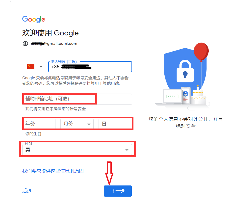點(diǎn)擊“下一步”輸入備用郵件地址和個(gè)人信息:
